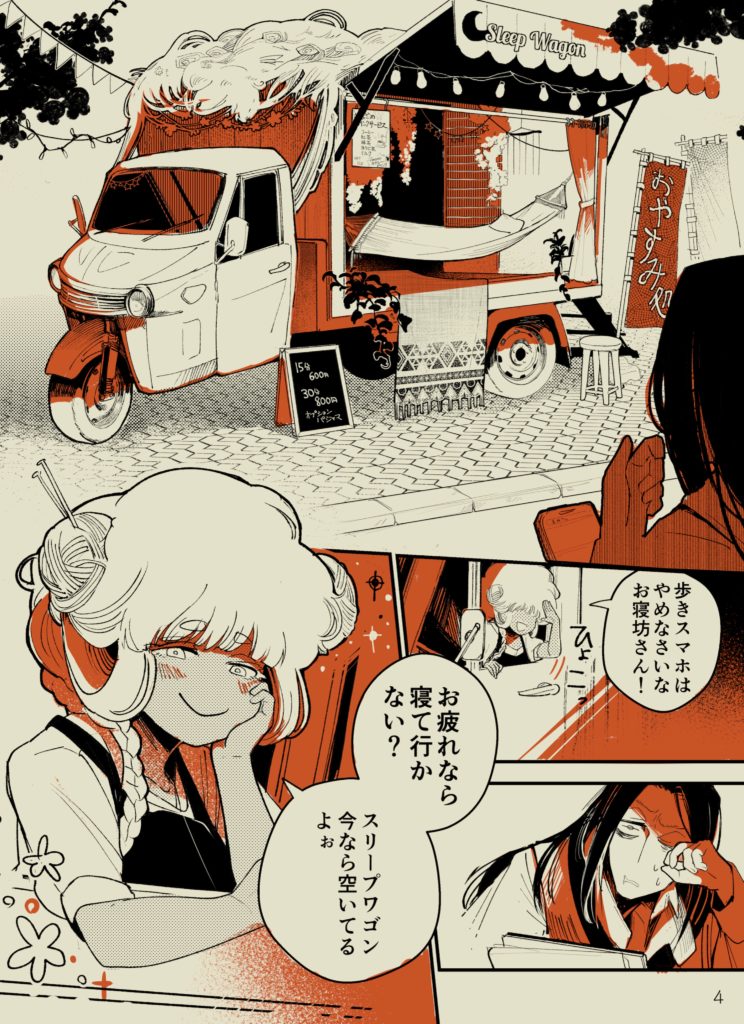 ヘトヘトな大学生が、街中で仮眠できる怪しいワゴンに遭遇する話。▼通販BOOTHXfolio(準備中)漫画 約12P、リソグラフ2色刷り(B6より少し大きめ 19cm×13.8cm相当)COMITIA154にて発行
